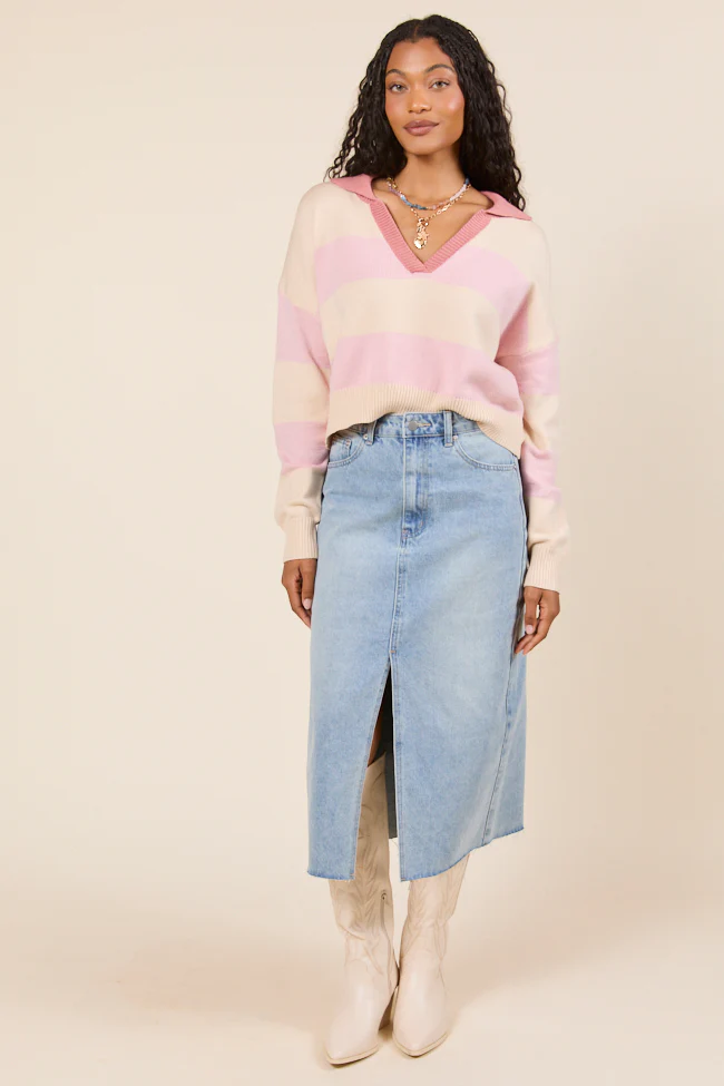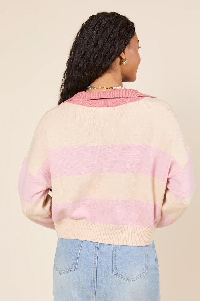 Hibiscus Pink and Cream Striped Collared V-Neck Sweater