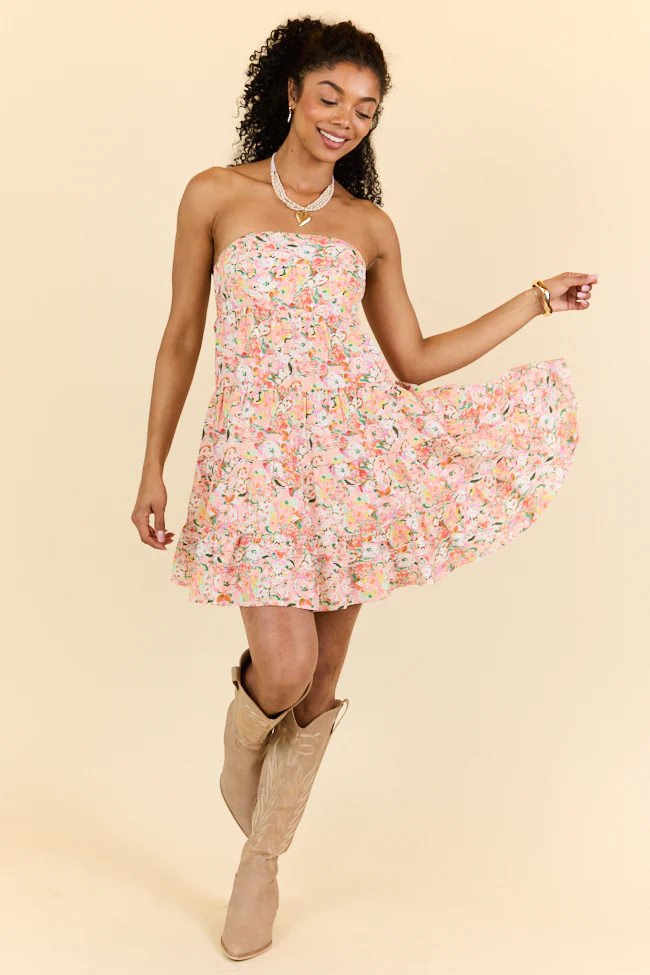 Sweet Thing Strapless Pink and Peach Printed Mini Dress SALE