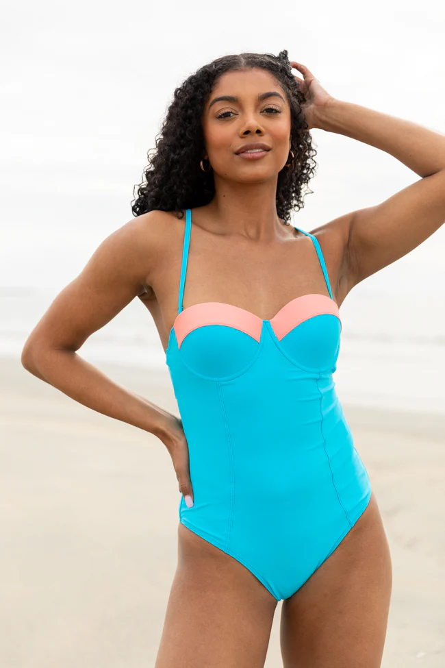 Sandbar Soiree Blue and Coral Contrast Trim One Piece Swimsuit FINAL SALE