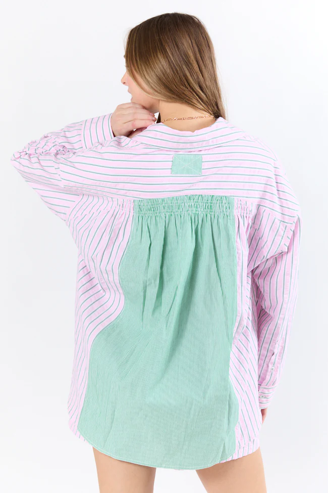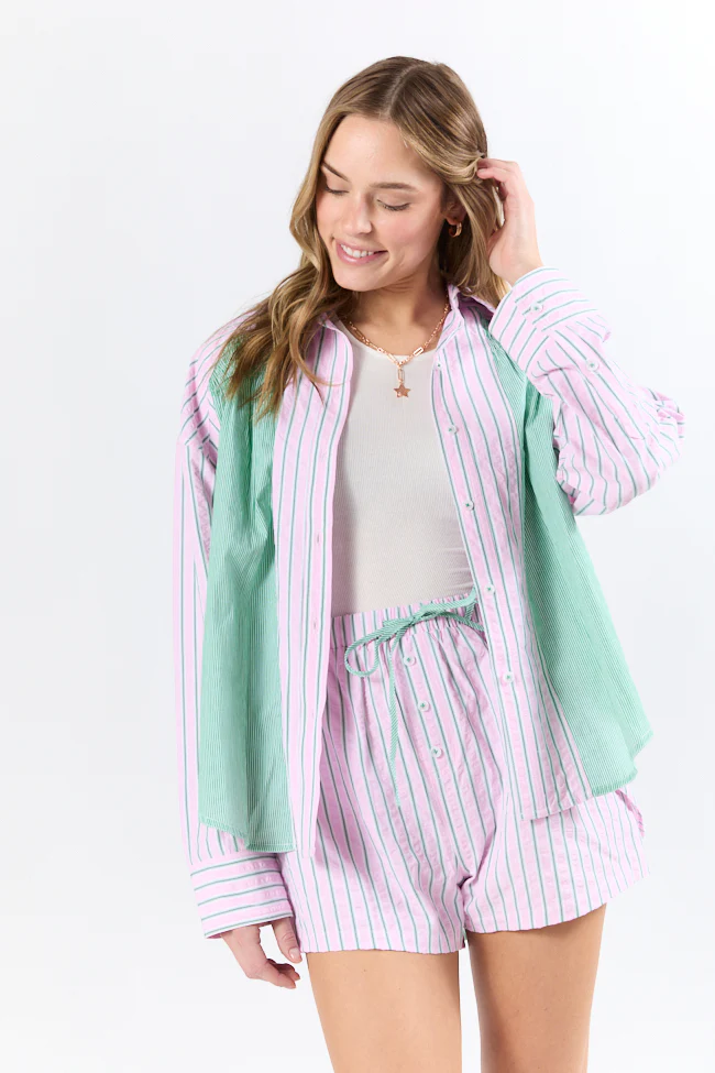 Palm Grove Light Pink and Green Multi Stripe Button Down Shirt DOORBUSTER