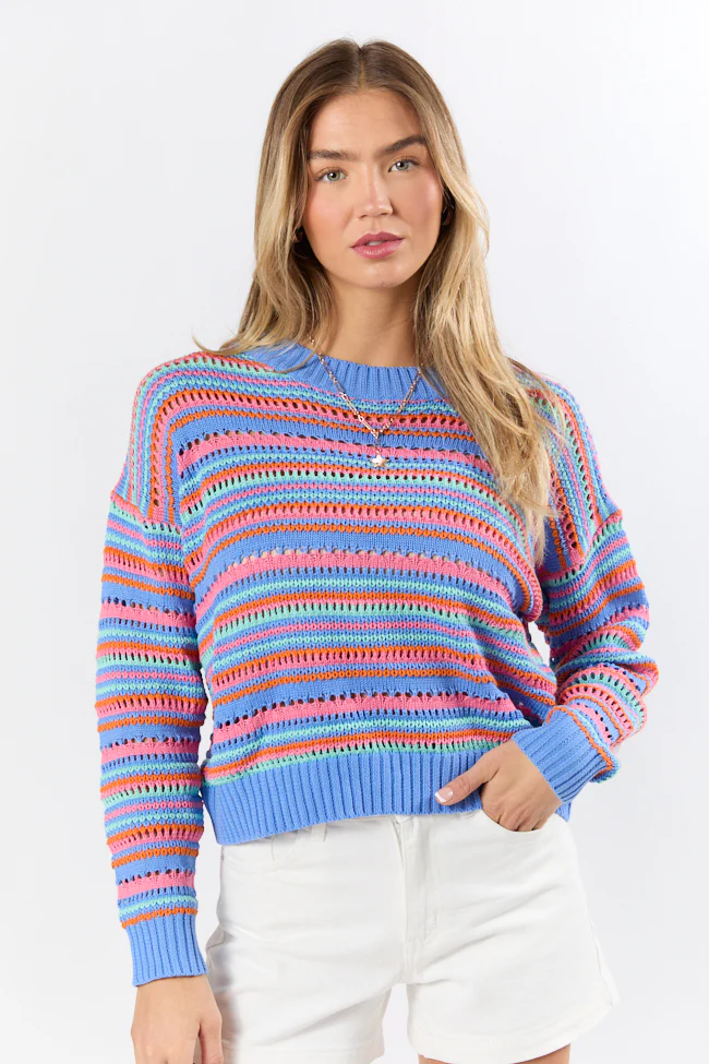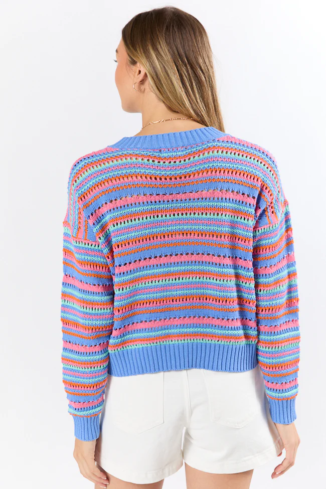 Party Cove Blue Multi Striped Open Knit Sweater FINAL SALE
