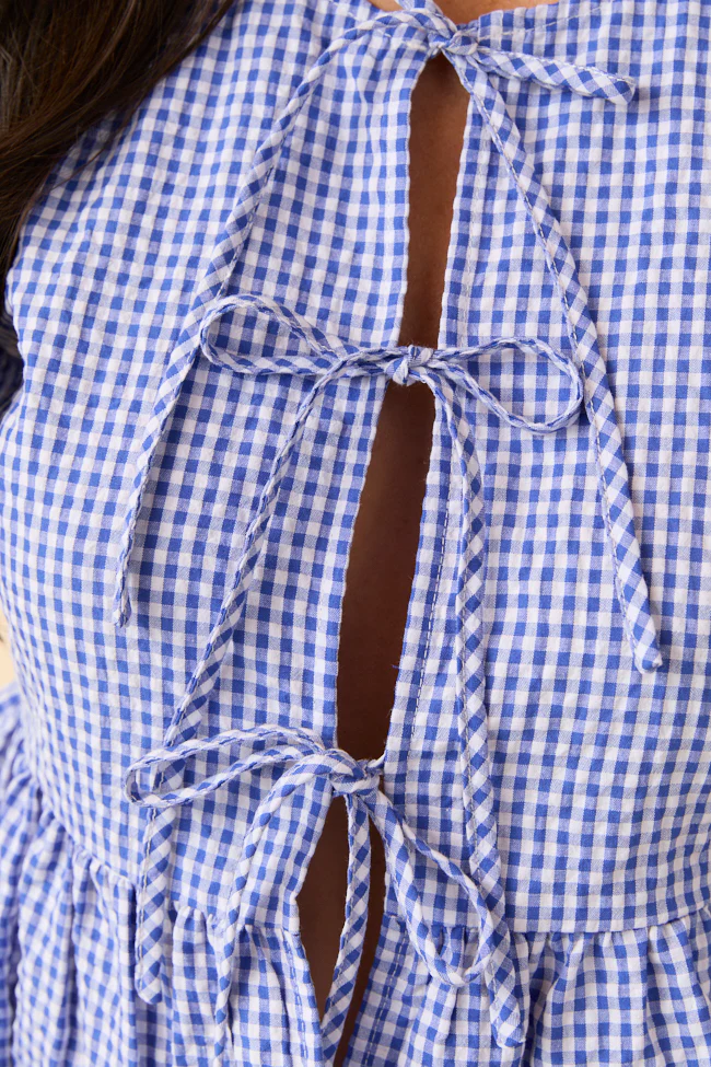 Mila Blue Gingham Tie Front Flounce Woven Blouse DOORBUSTER