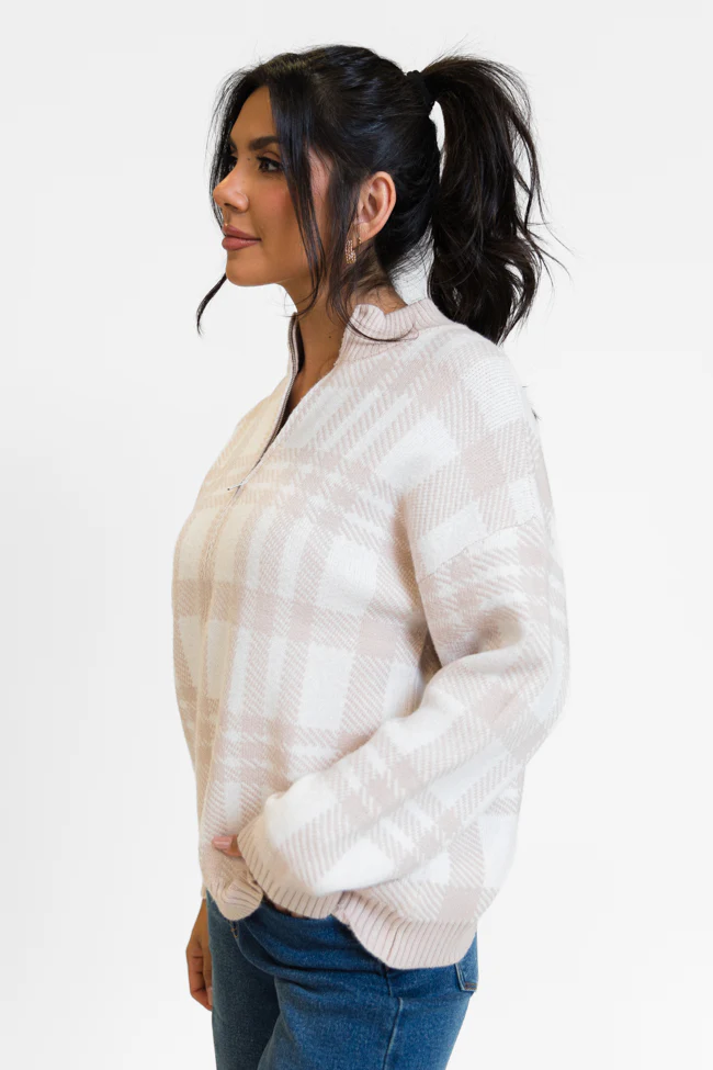 Make It Count Beige Plaid Printed Quarter Zip Pullover FINAL SALE