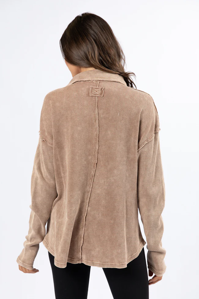 Leaf Your Worries Brown Acid Washed Waffle Collared Top