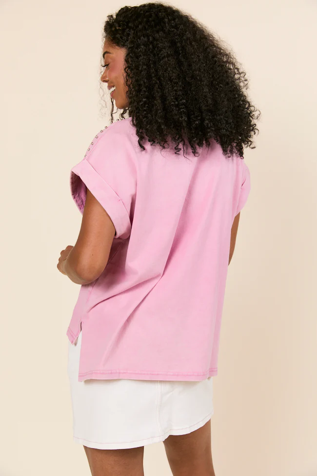 Kamryn Studded Short Sleeve Pink Acid Wash Tee
