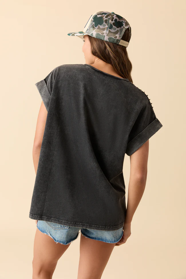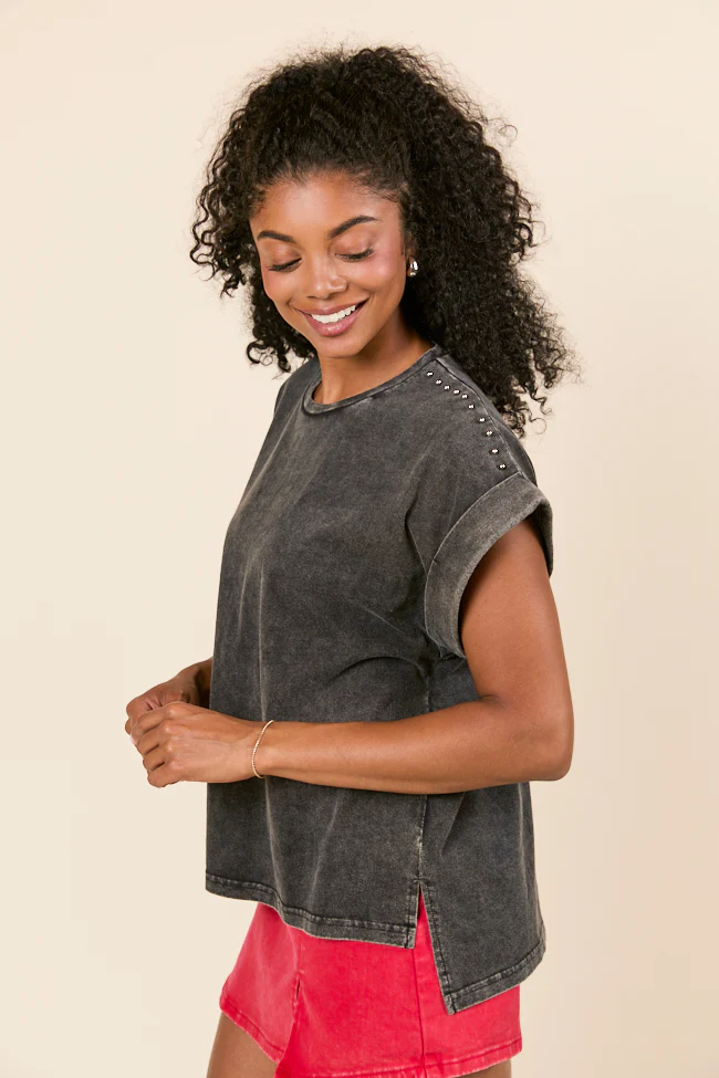 Kamryn Studded Short Sleeve Black Acid Wash Tee