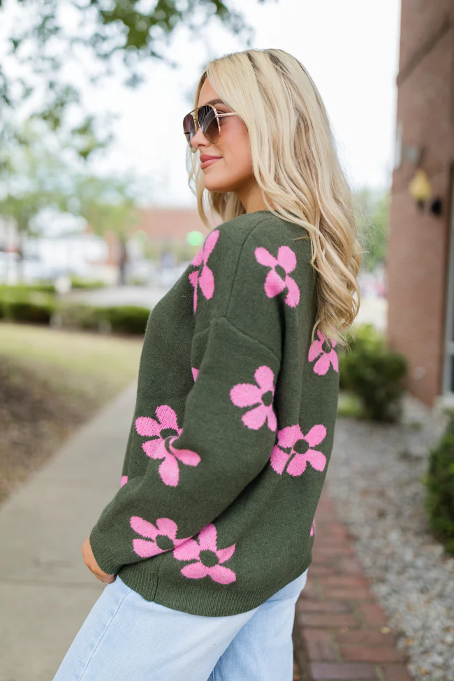 Keep You Around Olive and Pink Floral V-neck Sweater FINAL SALE
