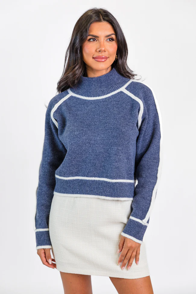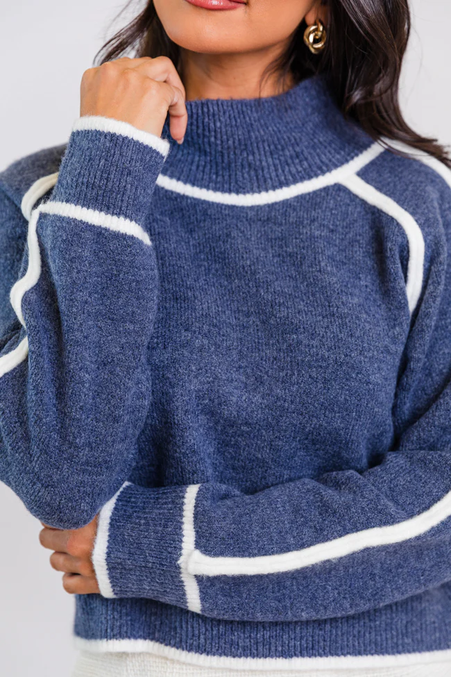In Between Navy and Ivory Contrast Stitch Mock Neck Sweater FINAL SALE