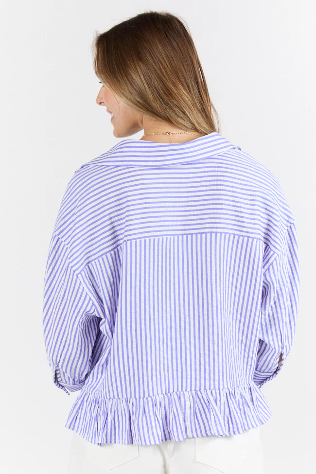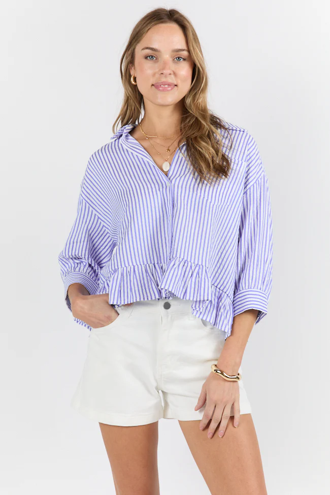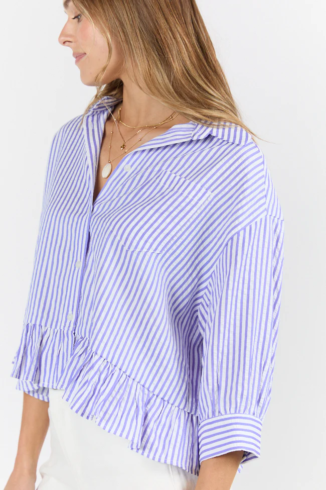 In Depth Blue Ruffle Hem Textured Stripe Button Down Top SALE