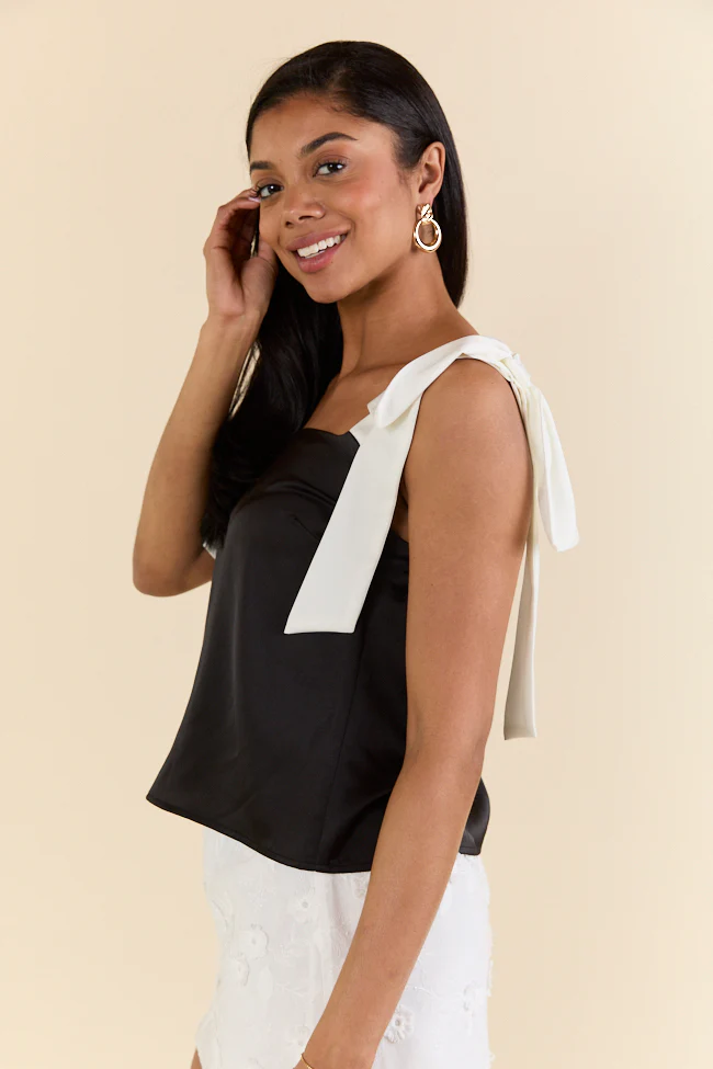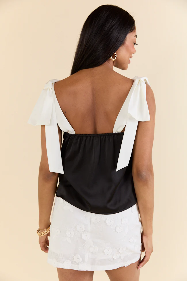 Classic Night Out Black and Ivory Satin Bow Sleeve Tank Top FINAL SALE