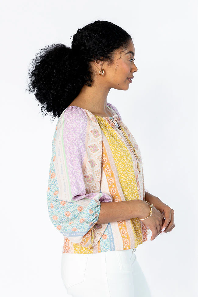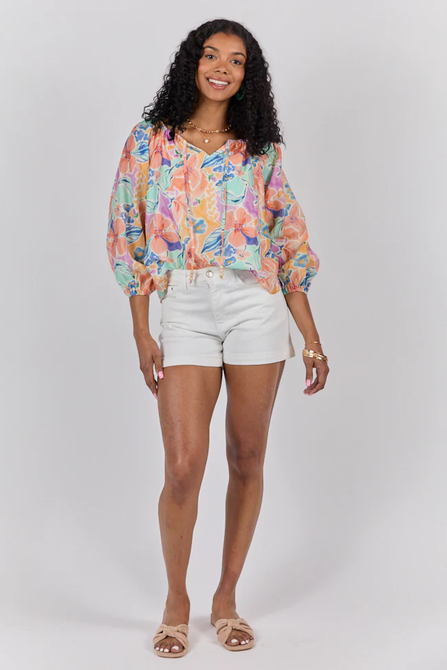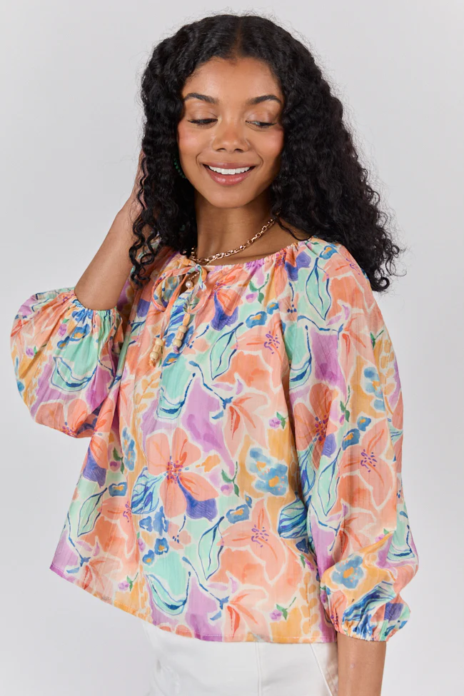 Come Along Multi Floral Patch Print Woven Pop Over Blouse FINAL SALE