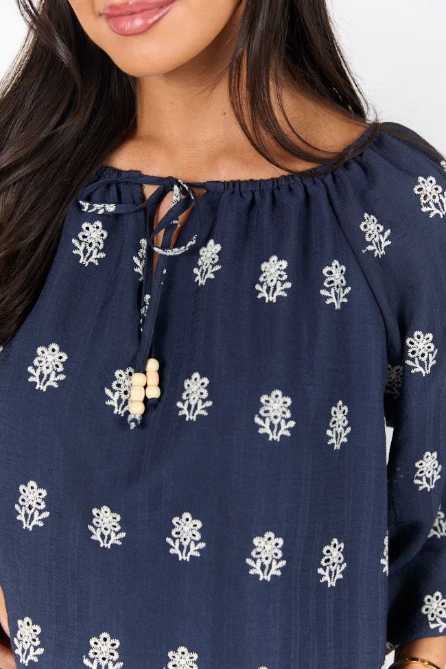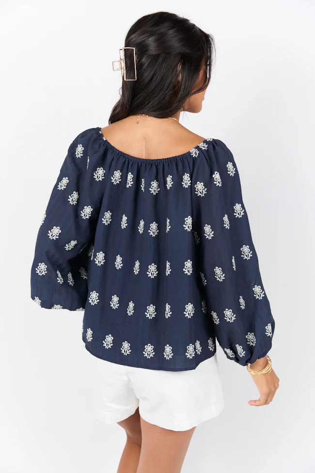 Come Along Navy Embroidered Woven Pop Over Blouse FINAL SALE