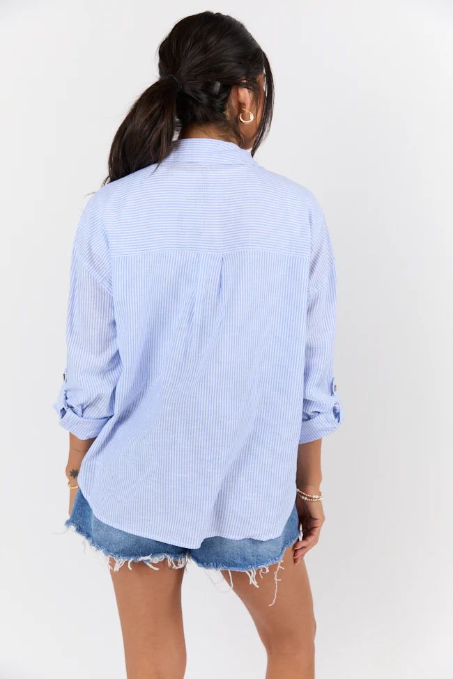 Coastline Walk Blue Striped Linen Blend Button Down Top FINAL SALE