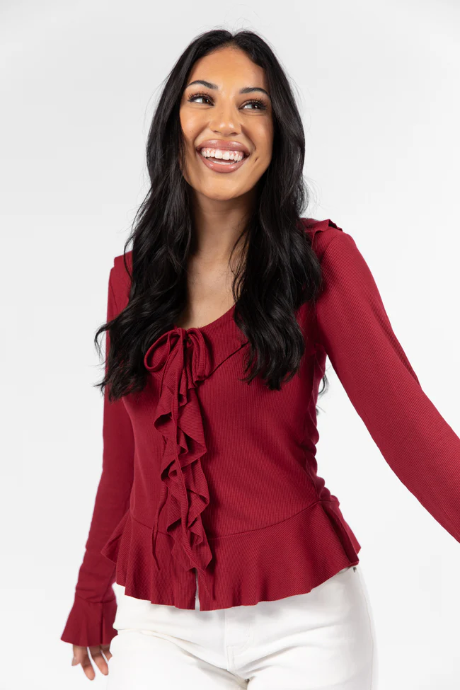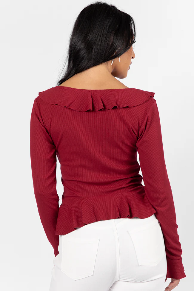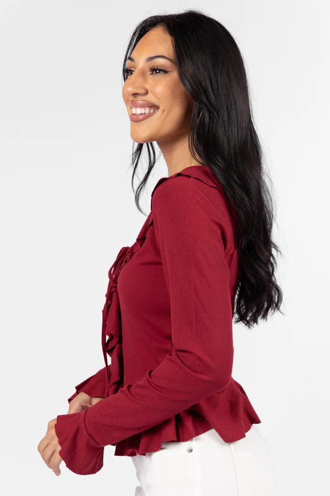 Treat You The Same Wine Ruffle Detail Ribbed Blouse FINAL SALE