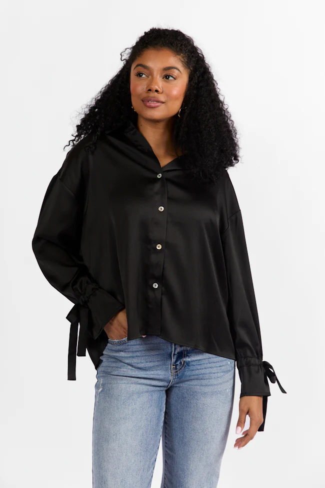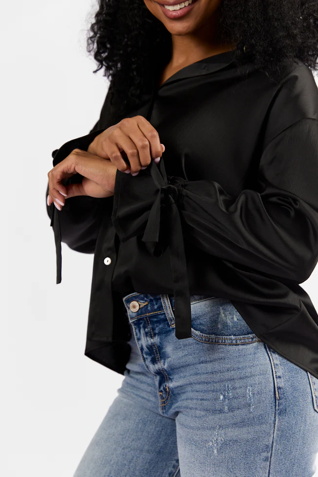 Think It Through Black Bow Cuff Satin Button Down Shirt FINAL SALE