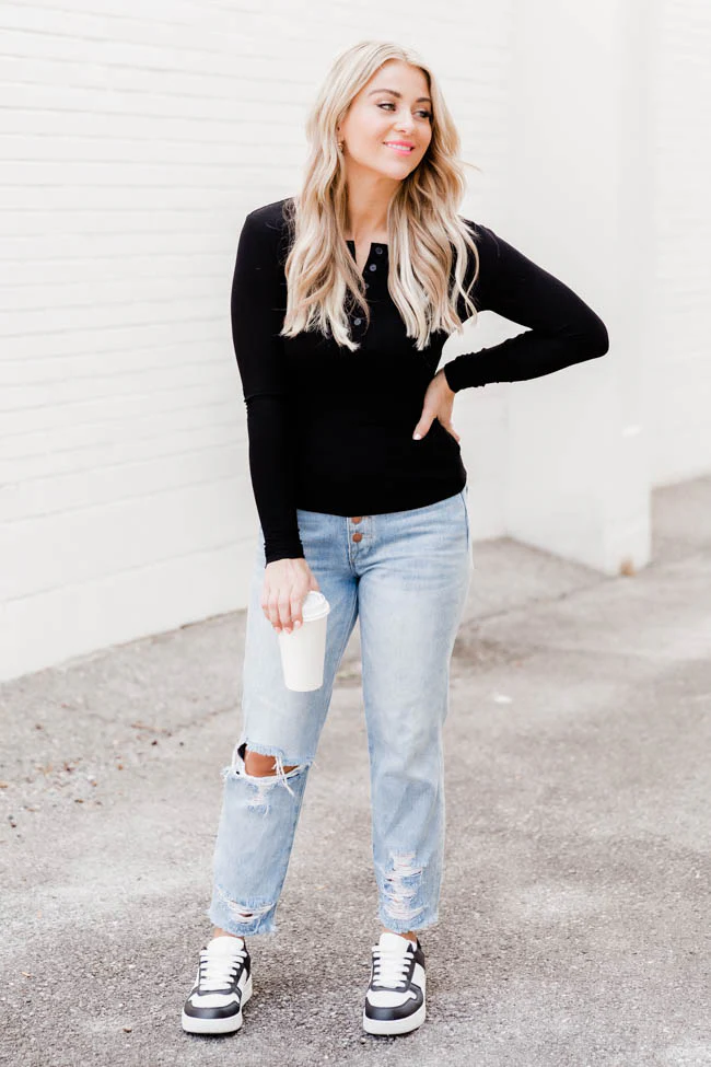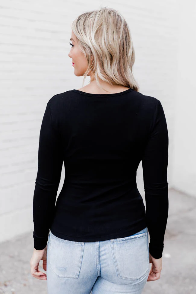 All The Better Black Ribbed Knit Henley Long Sleeve Tee FINAL SALE