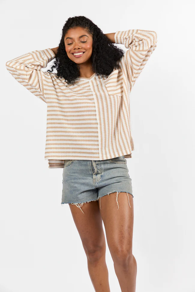 All For Sun Tan and Ivory Striped Knit V-Neck Long Sleeve Tee FINAL SALE
