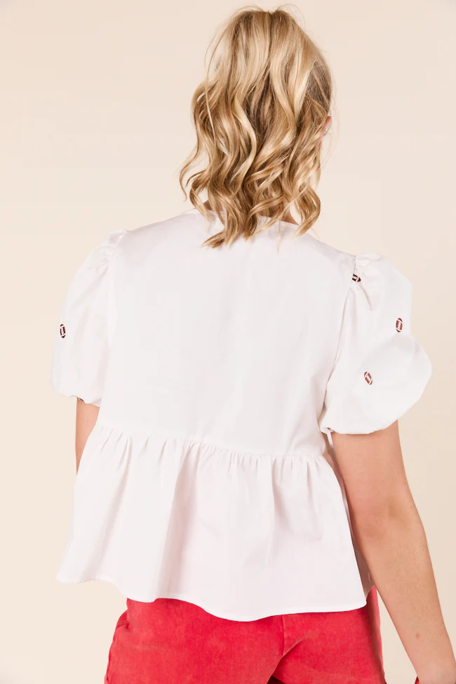 Angela Short Sleeve White Embroidered Football Peplum Top