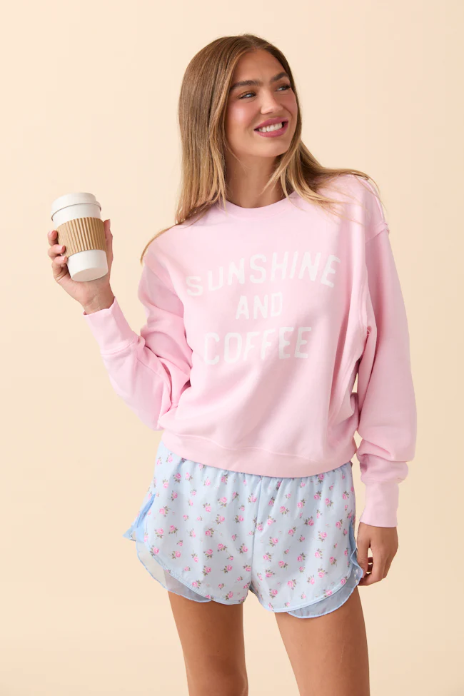 Sunshine and Coffee Soft Pink Raw Hem Fleece Graphic Sweatshirt