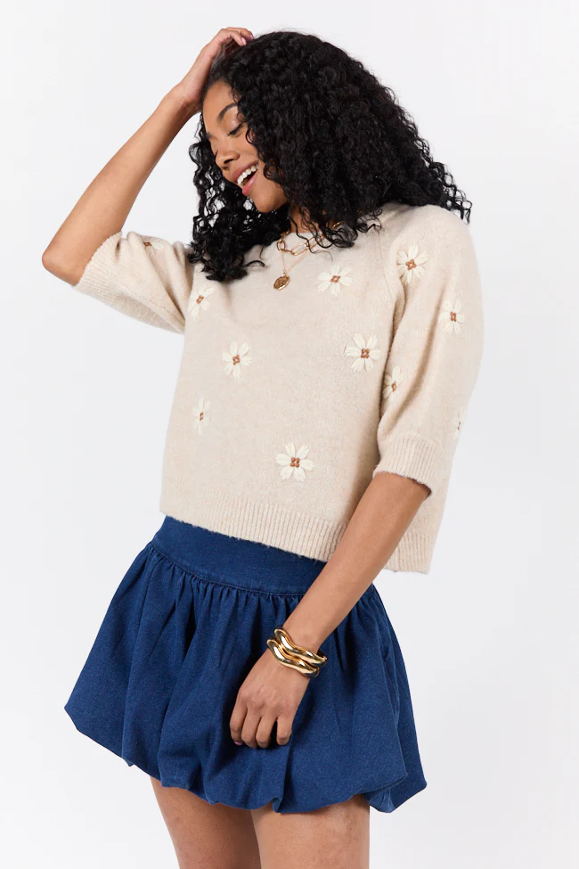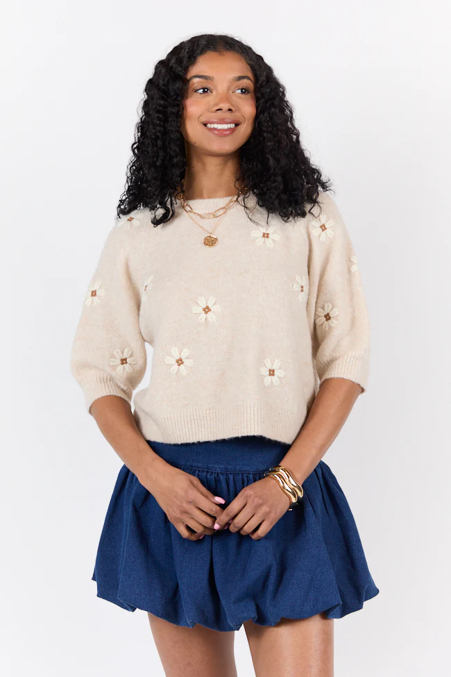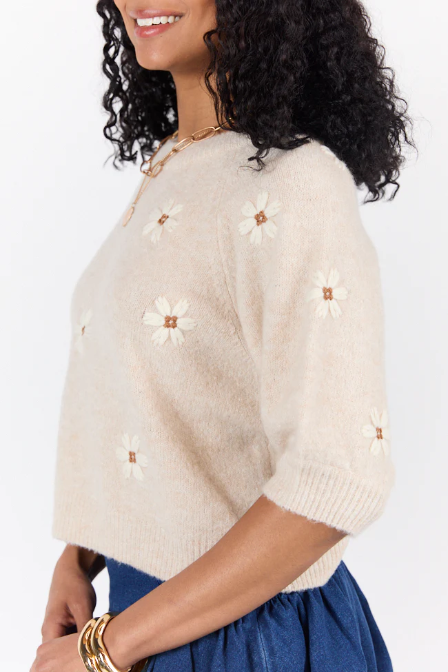 So Into You Oatmeal Short Sleeve Floral Embroidered Sweater