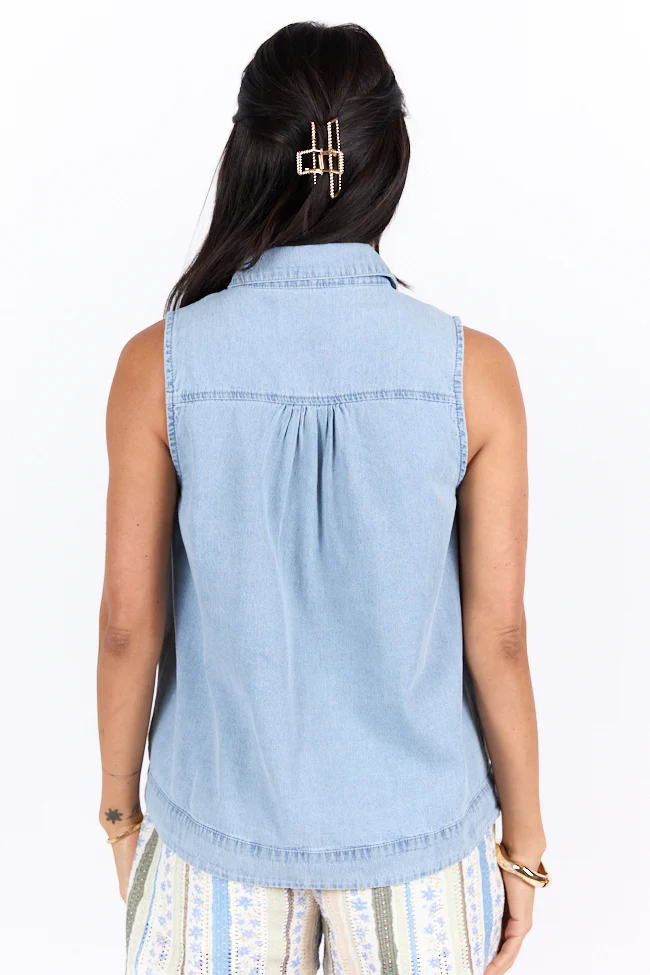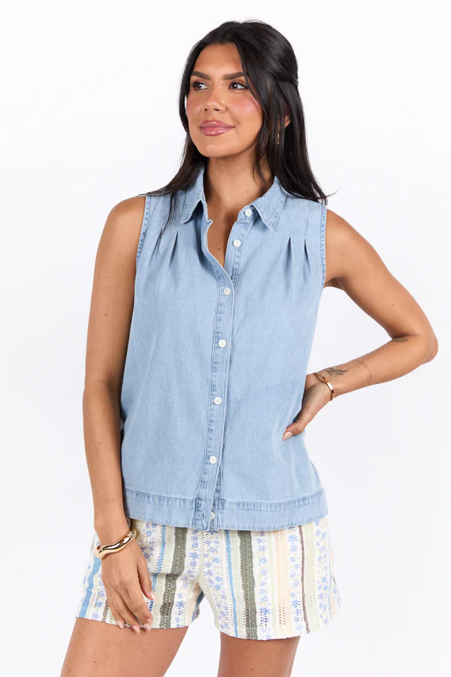 Smooth Sailing Light Wash Sleeveless Collared Chambray Tank SALE