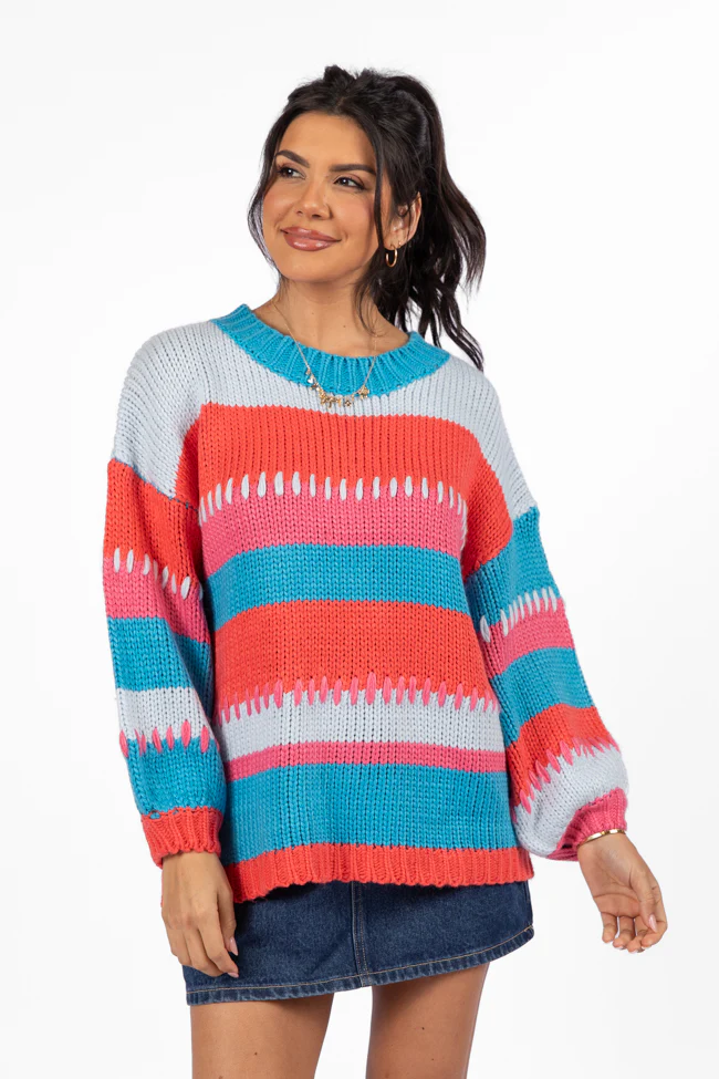 Something Extra Blue Multi Stripe Chunky Knit Stitch Detail Sweater FINAL SALE